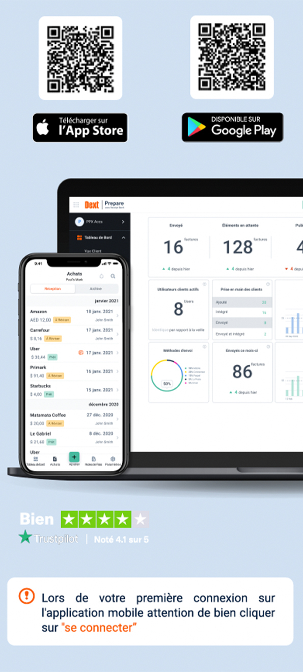 Utilisez l'application mobile Dext pour générer vos devis et vos factures en un seul endroit, puis transmettez-nous vos pièces comptables directement depuis cette plateforme.